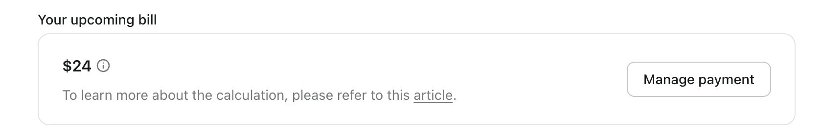 この場合、請求サイクル中にアドオン機能を更新したため、変更内容は次回の請求に反映されます。変更後の最初の月はやや高くなる場合があります。請求額には $24 の基本料金、未請求分のアドオン費用、次回サイクル分の全額が含まれます。