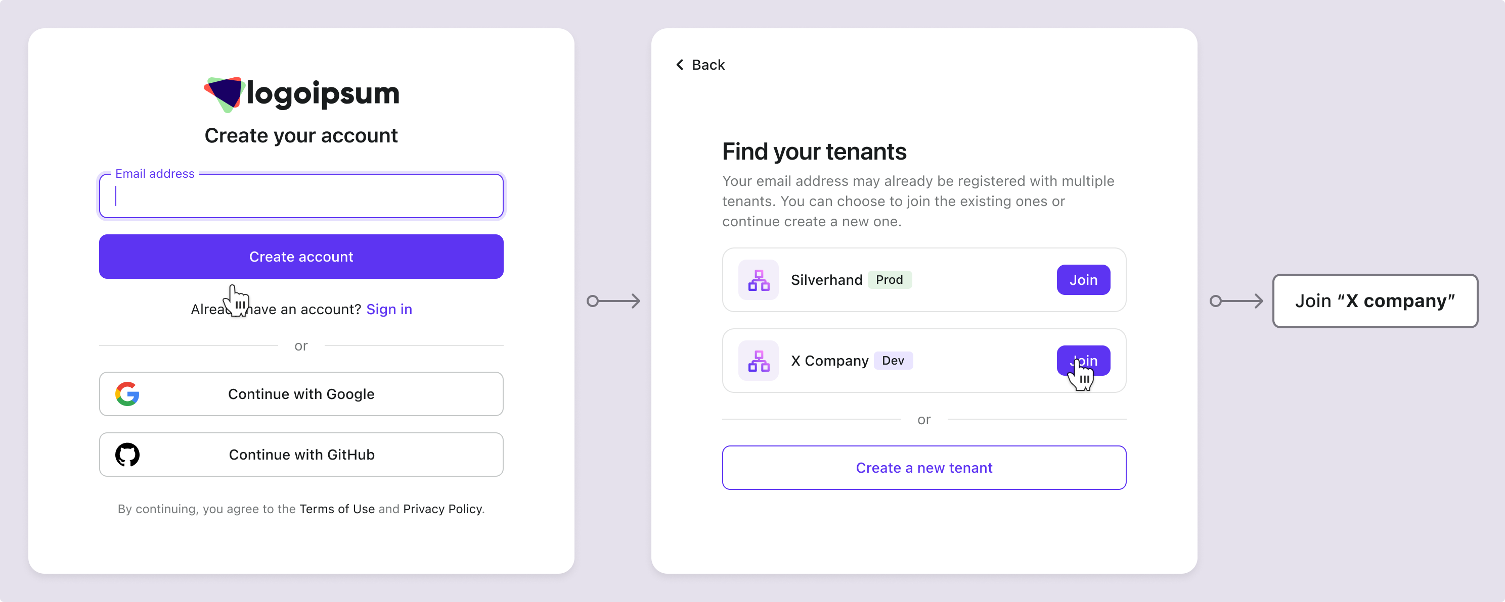 A lista de organizações e o fluxo de entrada geralmente aparecem durante o onboarding do usuário. Por exemplo, quando um administrador convida alguém para um workspace, mas o usuário ignora o convite por e-mail e faz login ou cadastro diretamente no aplicativo.