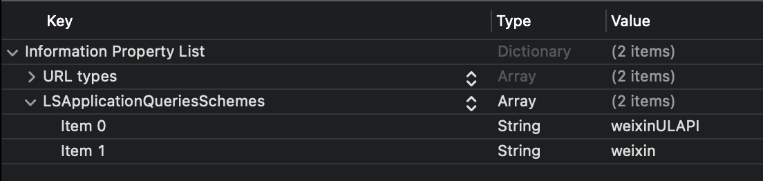 最后打开你的 Info.plist,在 LSApplicationQueriesSchemes 下添加 weixinULAPI 和 weixin。