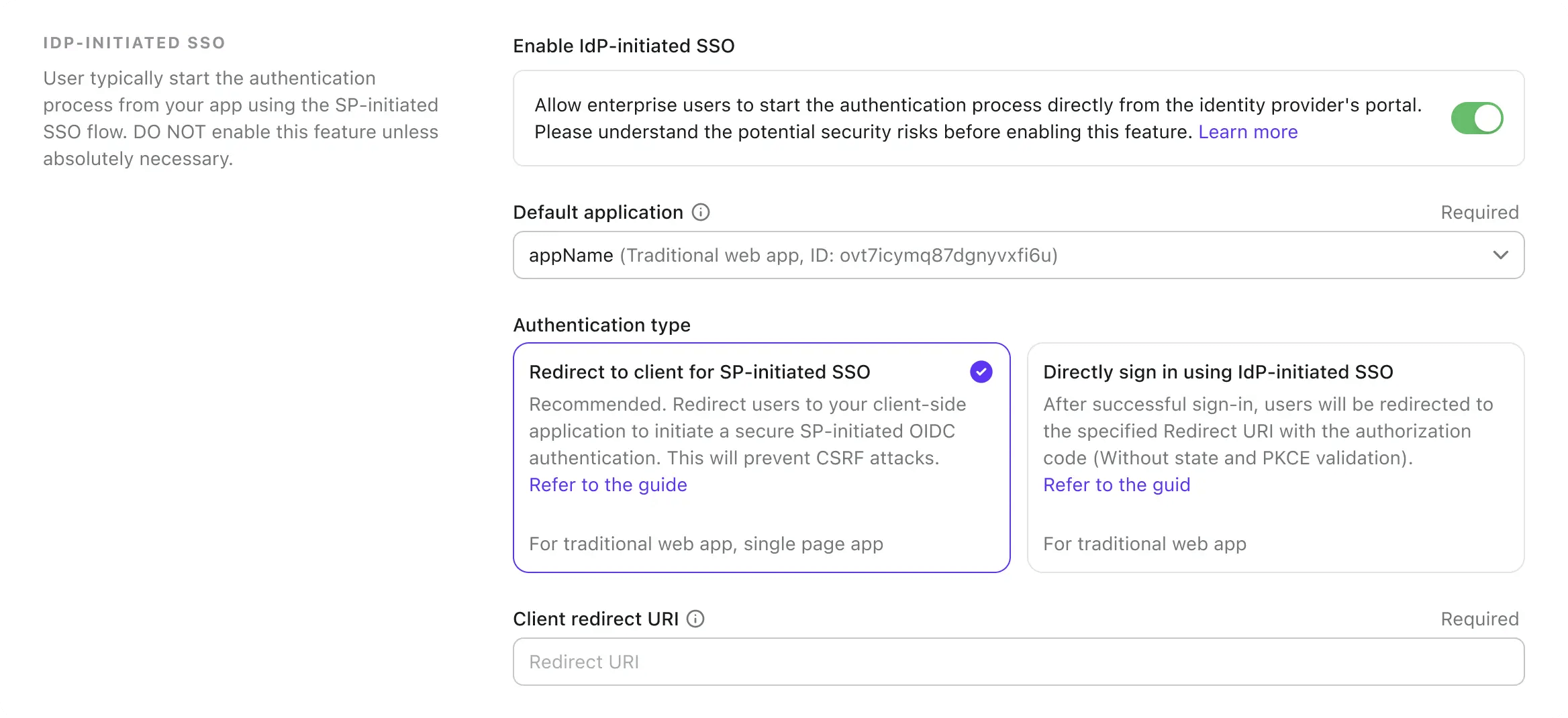?ssoConnectorId={connectorId}查詢參數附加到 URL 進行重定向。客戶端應用程式應處理重定向並發起 OIDC 驗證請求。(我們建議在客戶端應用程式中使用專用路由或頁面來處理 IdP-initiated SSO 驗證請求。) -